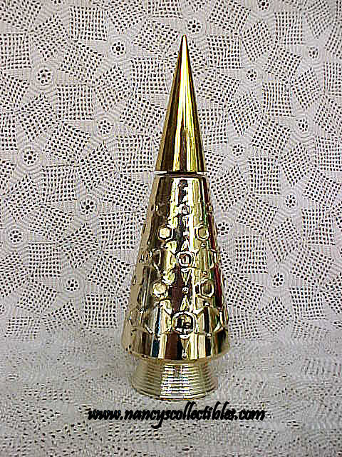 A vintage Avon bubble bath bottle. It is an empty bottle in the shape of a Christmas tree. Net weight is 4 fl.oz. It measures 7-3/4" tall, 2-1/2" wide. The bottle is gold foil on clear glass with a matching top to complete the tree. The bottle is in excellent condition; no cracks, chips, or breaks. It does have a few foil flakes on the base of the tree. The label is intact and is in excellent condition. It is dated at 1968-1970.