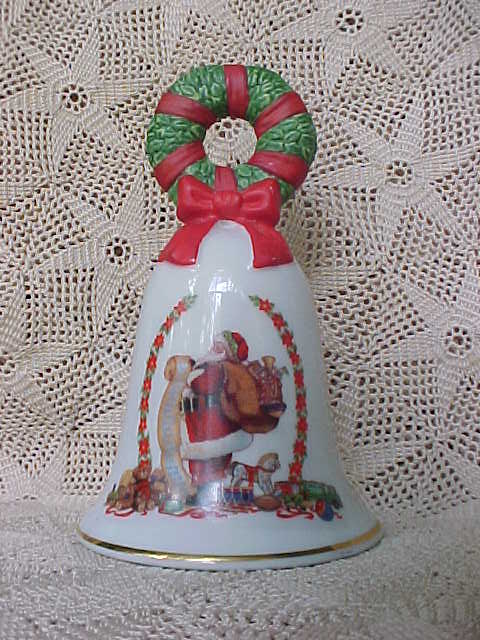A vintage Avon Christmas Bell. It is titled "Sounds of Christmas" and is dated 1995. The handle is a Christmas wreath wrapped in red ribbon with a red bow at the bottom. On the front of the bell is Santa checking his list while carrying a bag of toys. There are various toys at his feet and a string of poinsettias on each side of Santa. It is also trimmed in gold at the base. It is in excellent condi- tion; no chips, cracks, or breaks. It measures 4" tall, 2-1/2" in diameter at its base. It is marked inside the bell "Avon, 1995, Source of Fine Collectibles".