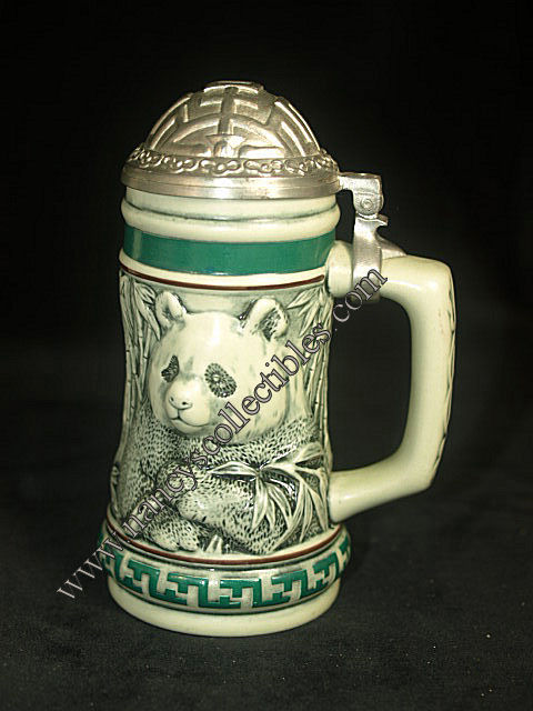 A Collector's series stein of the Endangered Species collection of the Giant Panda. It is in excellent condition. It measures 5-1/2" tall; 3-1/2" wide, including the handle. The lid is metal. It is marked "Avon, Endangered Species: Giant Panda, Hand- crafted in Brazil exclusively for Avon Products, Inc., Dist. 1991".