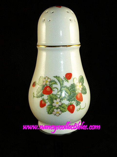 Strawberry Sugar Shaker by Avon. It is porcelain with a picture of strawberries and its flowers on the front and top, a stopper in the bottom for re- filling, trimmed in 22 kt. gold. It is dated 1979. It contained strawberry perfumed talc. This is an empty container. It is in excellent condition; no chips, cracks, or repairs. It measures 5" tall, 2-1/2" wide. It is marked "Avon, Porcelain, 22k Gold Trim, Made in Brazil".