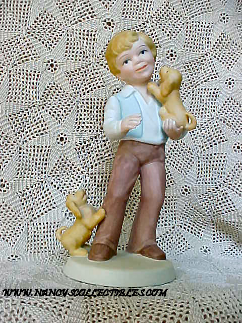 An Avon porcelain figurine of a boy holding a puppy with another at his feet. He is wearing a white shirt, blue vest and brown pants and shoes. The bottom is marked "Best Friends, Exclusively Handcrafted for Avon, 1981". It measures approximately 6" tall and 2-3/4" in diameter. It is in excellent condition; no chips, cracks, or repairs.
