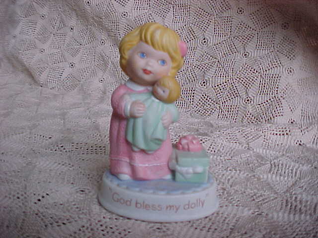 An Avon "Tender Memories" collectible figurine. It is titled, "God Bless My Dolly". It is of a little girl holding her dolly. She is dressed in a full-length pink dress. She has a matching pink bow in her blonde hair. Her dolly is dressed in a long green dress with blonde hair. There is a green gift box with a pink bow on the floor next to her. It measures 3-3/4" tall, with an oval base 2-3/4" wide, 2" deep. The figurine is in excellent condition; no chips, cracks, breaks, or repairs. It is marked "Avon Tender Memories, 1990".