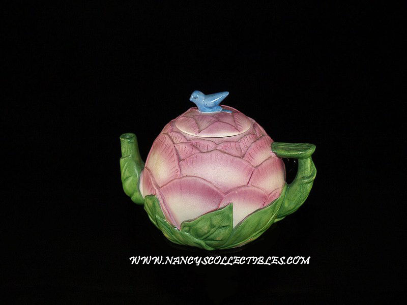A small handpainted teapot by Avon. It is dark pink in color with the lid having a bluebird for the for the top handle. The body of the teapot has the pink petals of a peony and green leaves for the bottom; the handle and spout is the stem. It is in excellent condition; no chips, cracks, or repairs. It measures 3-1/2" tall, 4" wide(in- cluding the handle and spout. It is marked "Source of Fine Collectibles, Avon, 1995". Not for food use.