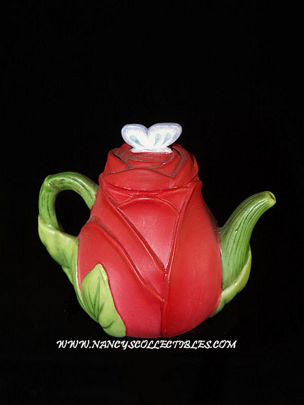 A small handpainted teapot by Avon. It is deep red in color with the lid having a blue and white butterfly for the for the top handle. The body of the teapot has the red petals of a rose and green leaves for the bottom; the handle and spout is the stem. It is in excellent condition; no chips, cracks, or repairs. It measures 3-1/2" tall, 4" wide(in- cluding the handle and spout. It is marked "Source of Fine Collectibles, Avon, 1995". Not for food use.