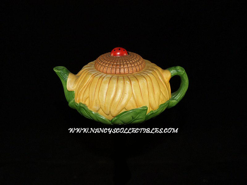 A small handpainted teapot by Avon. It is yellow in color with a brown lid and a ladybug for the for the top handle. The body of the teapot has the yellow petals of a sunflower and green leaves for the bottom; the handle and spout is the stem. It is in excellent condition; no chips, cracks, or repairs. It measures 2-1/4" tall, 5" wide(in- cluding the handle and spout. It is marked "Source of Fine Collectibles, Avon, 1995". Not for food use.