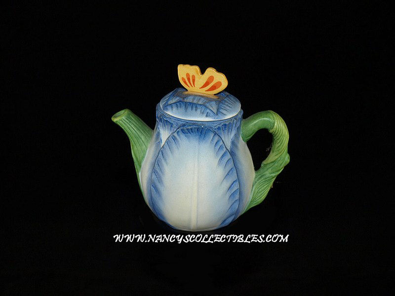 A small handpainted teapot by Avon. It is blue in color with a yellow butterfly for the top handle. The body of the teapot has the petals of a tulip; the handle and spout is the stem. It is in excel- lent condition; no chips, cracks, or repairs. It measures 3-1/2" tall, 4" wide(including the handle and spout. It is marked "Avon, Source of Fine Collectibles, 1995". Not for food use.