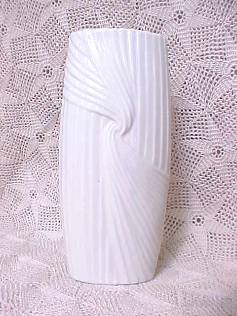 A very elegant vase by Avon. It is cream in color with embossed lines and swirls on each corner and is oval in shape. It looks like it has never been used. It is in excellent condition; no chips, cracks, or repairs. It measures 6" tall, 2-1/4" wide, and 1-3/16" deep. It is marked "©Avon".
