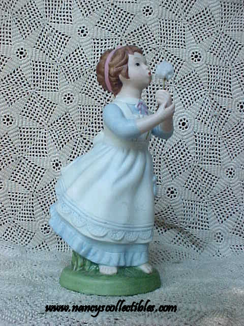An Avon porcelain figurine of a girl making a wish. It is titled "Wishful Thoughts. She is wearing a blue dress with a pale blue pinafore over it. She has a pink bow in her hair. The bottom is marked "Handpainted Porcelain, Created Exclusively for Avon, Avon 1982". It measures approximately 5-1/2" tall and 3-1/2" wide. It is in excellent condition;no chips, cracks, or repairs.