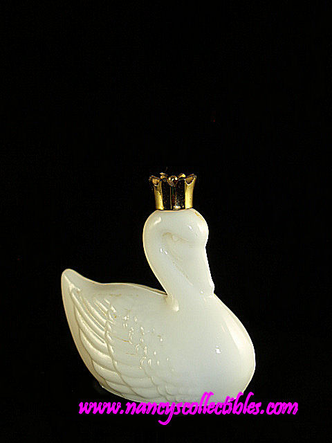 This is a white glass bottle in the shape of a swan. It has a gold cap in the shape of a crown. It is dated 1971-1972. The label is stained but is in otherwise excellent condition. The bottle is in excellent condition; no cracks or repairs. It measures 3" tall(including lid). The label is marked "Avon, Topaze Cologne, 1 oz.". This is an empty bottle.