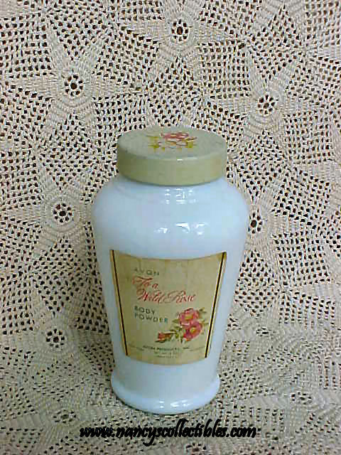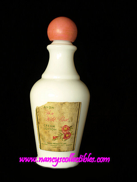 This is a white glass bottle with a pink cap. It has a paper label decorated with flowers and leaves. It is dated 1965. The label has been torn on one corner. The bottle is in excellent condition; no cracks or repairs. It measures 6" tall(including lid). It is imprinted on the bot- tom "Avon". This is an empty bottle.