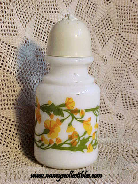 This is a white glass with an orange floral design and a white plastic top. It is dated 1967. It is in excellent condition; no cracks or repairs. It measures 4-1/2" tall(including top) and 2" in di- ameter. It is missing its label. This is an empty container.