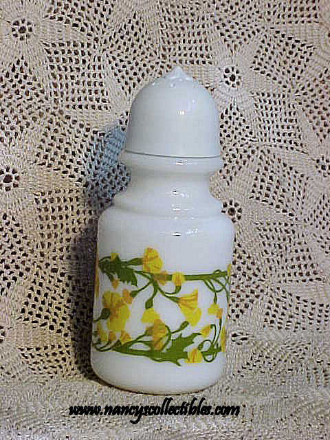 This is a white glass with a yellow floral design and a white plastic top. It is dated 1967. It is in excellent condition; no cracks or repairs. It measures 4-1/2" tall(including top) and 2" in di- ameter. It is marked "Avon, Jasmin Foaming Bath Oil, 3 Fl.Oz.". This is an empty container.