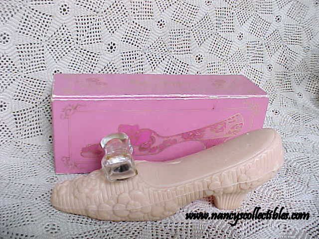 A vintage Avon perfumed soap in the shape of a lady's slipper. It also includes a 1 dram bottle of Cotillion cologne in the shape of a bow which decorates the top of the "slipper" It is titled "Lady Slipper" and is dated 1970-1971. The bottle is clear glass. It is in excellent condition; no chips, cracks, or breaks. The perfumed soap does have a small scratch on the top of the slipper. It measures 2-1/2" tall, 6-1/2" long. The bottle is marked "Avon,1 dram, Cotillion". It is in its ori- ginal box.