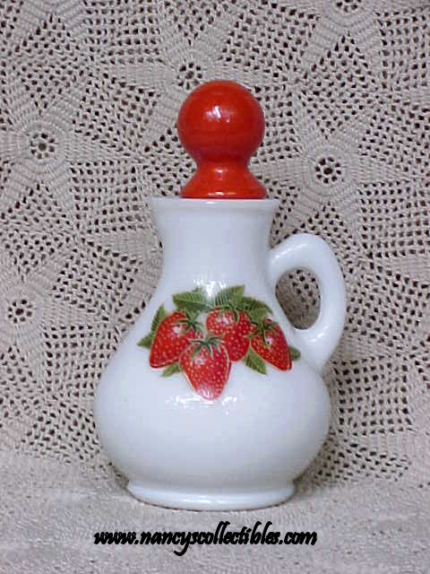 This is a milk glass cruet with an orange glass stopper. It is decorated with strawberries and leaves. It is dated 1970. It is in very good con- dition; no cracks or repairs. The pour spout does have a chip. It measures 5" tall(including stopper), and 3" in diameter. It is marked "Avon,Strawberries and Cream Bath Foam, 4 fl. oz". This is an empty container.