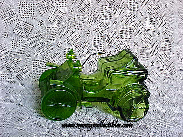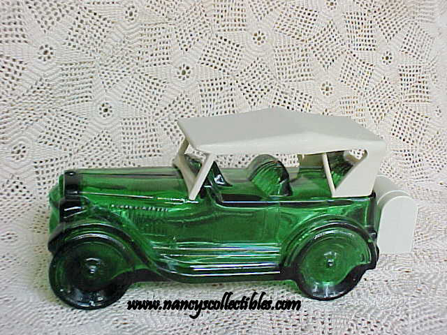 An Avon green glass bottle in the shape of a 1902 Haynes-Apperson with a green plastic front cap. It has a metal steering rod. It measures 5" long. It is in excellent condition; no chips, cracks, breaks, or repairs. It is marked "Avon,Haynes-Apperson 1902, Tai Winds After Shave,5 fl. oz.". It is dated 1973- 1974.