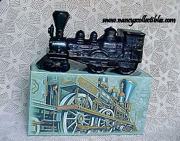 This is a clear blue glass bottle painted silver with a blue plastic cap in the shape of The General 440 loco- motive. It contained "Tai Winds" After Shave. It is a 5.5 fl.oz. bottle in excellent condition; no chips, cracks, or repairs. The label is intact and in excellent condition. This bottle is dated 1971-1972. It measures 7" long. It is marked "Avon,Tai Winds After Shave,5.5 fl.oz.". It is in its original box and packing.