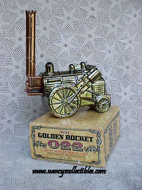 This is a smoky gold over clear glass bottle with a gold plastic cap in the shape of the Golden Rocket 0-2-2. It contained "Tai Winds" After Shave. It is a 6 fl.oz. bottle in excellent condition; no chips, cracks, or repairs. The label is intact and in excellent condition. This bottle is dated 1974-1976. It measures 5-1/2" long. It is marked "Avon, Tai Winds After Shave,6 fl.oz.". It is in its original box and packing.