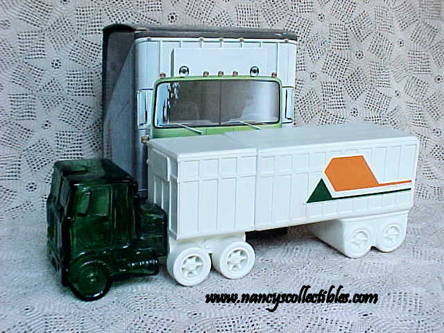 An Avon 4 oz. green glass bottle with white plastic center connection piece and a 6.5 oz. rear section talc bottle in the shape of a cab and trailer truck. It measures 10" long. It is in excellent condition; no chips, cracks, breaks, or repairs. The green glass bottle is marked "Avon,Highway King, Everest After Shave,4 fl. oz.".The white plastic section is marked "Avon,Highway King,Everest Talc,6.5 oz.". It is dated 1977-1979.