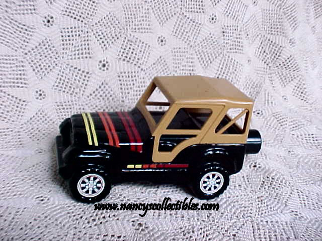 This is a black glass bottle with stick-on details, and tan plastic top in the shape of a Jeep Renegade. It contained "Trazarra" Cologne. It is a 3 fl. oz. bottle in excellent condition; no chips, cracks, or repairs. The label is intact and also in excellent condition. This bottle is dated 1981-1982. It mea- sures 5" long. It is marked "Avon, Jeep Renegade Decanter,Trazarra Cologne,3 fl. oz.".