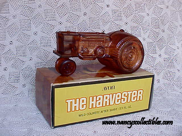 This is an amber clear glass bottle with an amber plastic front cap in the shape of a Harvester tractor. It contained "Everest" After Shave. It is a 5.5 fl.oz. bottle in excellent condition; no chips, cracks, or repairs. The label is intact and in excellent condition. This bottle is dated 1973-1975. It measures 6" long. It is marked "Avon,Wild Country After Shave,5.5 fl.oz.". It is in its original box and packing.