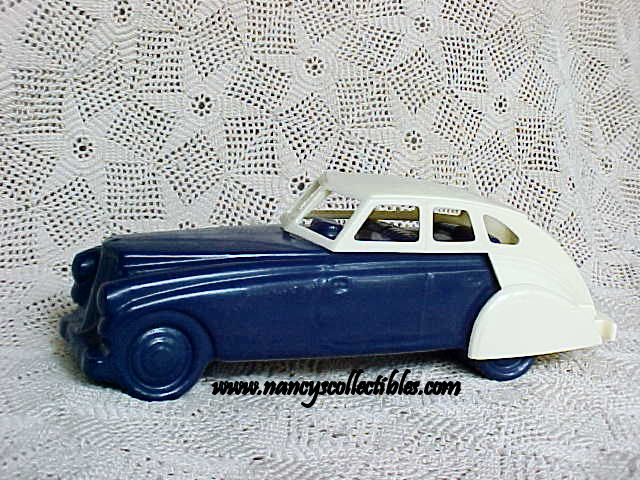 This is a clear glass bottle painted dark blue with a beige plastic cap in the shape of a '33 Pierce Arrow. It contained "Wild Country" After Shave. It is a 5 fl. oz. bottle in excellent condition; no chips, cracks, or repairs. The label is intact and in excellent condition. This bottle is dated 1975-1977. It measures 6-1/2" long. It is marked "Avon,Wild Country After Shave,5 fl. oz.". It is in the original box.