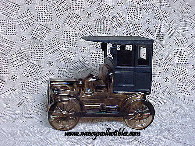 An Avon bottle in the shape of a Packard Roadster in light amber glass and matching plastic rumble seat cap. It measures 6" long. It is in excellent condition; no chips,cracks, breaks, or repairs. It is marked "Avon ,Packard Roadster,Oland Cologne,6 fl. oz.". It is dated 1970-1972. It is in its original box.