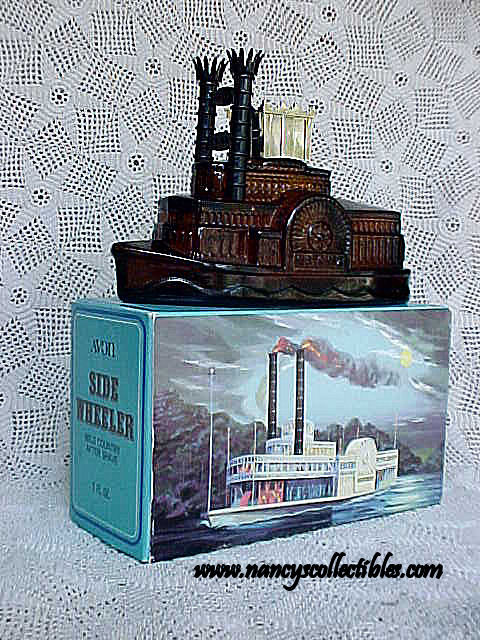 This is a dark amber glass bottle with black plastic stacks and a silver cap in the shape of a steamboat. It contained "Wild Country" After Shave. It is a 5 fl. oz. bottle in excellent condition; no chips, cracks, or repairs. The label is intact and in excellent con- dition. This bottle is dated 1971-1972. It measures 6" long. It is marked "Avon,Wild Country After Shave,5 fl. oz.". It is in its original box and packing.