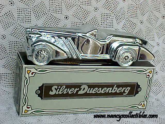 This is a painted silver over clear glass bottle with a silver plastic cap in the shape of a Duesenberg. It contained "Oland" After Shave. It is a 6 fl. oz. bottle in excellent condition; no chips, cracks, or repairs. The label is intact and in excellent condition. This bottle is dated 1970-1972. It measures 7-1/2" long. It is marked "Avon,Silver Duesenberg,Oland After Shave, 6 fl.oz.". It is in its original box and packing.