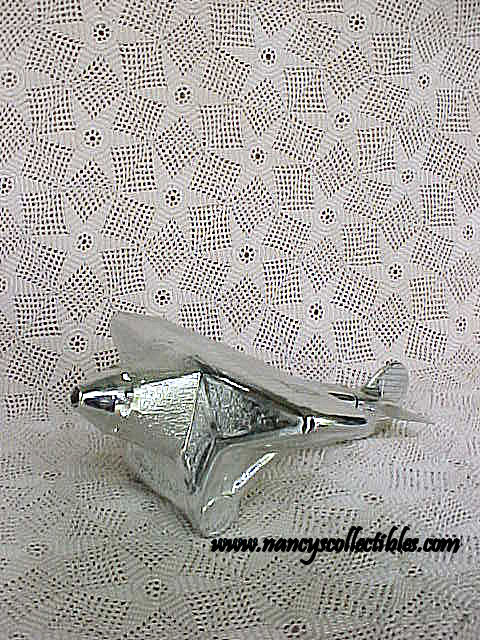 An Avon bottle in the shape of an airplane painted silver on clear glass. It is called "Spirit of St. Louis". It measures 2-1/2" tall, 8" long. It is in excellent condition; no chips, cracks, breaks, or repairs. It is marked "Windjammer After Shave,6 oz.". It is dated 1970-1972.
