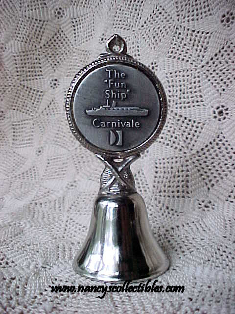 A souvenir bell from the "Fun Ship" Carnivale. It has a replica of the ship as part of the handle. Your chance to obtain the bell you were unable or forgot to get on your cruise! It is in excellent condition. It measures 3-3/4" tall(including the handle), and 1-1/2" in di- ameter.