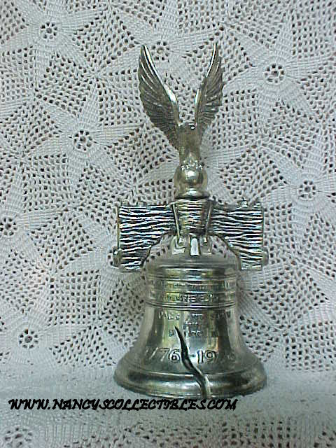 A souvenir bell, possibly from Philadephia. It is a replica of the Liberty Bell. It is in excellent condition. It measures 5-3/4" tall(including the handle), 2-1/2" wide.