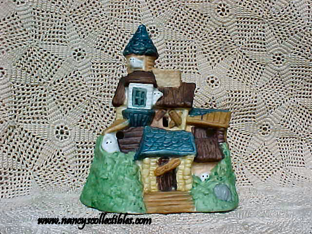 This is a ceramic haunted castle votive candleholder. There are ghosts peering from a window, behind bushes, and on the roof. The votive candle is placed in the back to shine through the open windows to give an eerie appearance. It is in excellent condition; no cracks, chips, or repairs. It is unmarked. It measures approx- imately 4" tall and 3-1/2" wide.
