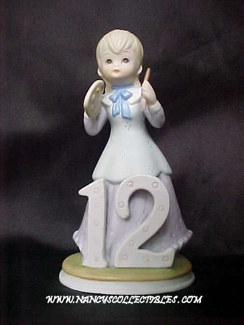 A really cute figurine for that 9th birthday! It is Lefton's "Christopher Collection" birthday series. This one is for the 9th birthday. She is wearing a pink dress with ruffles on the bottom. She is holding a small puppy. The number "9" is in front of her. She has short brown hair with brown eyes. She has been repaired at the waist. It is marked "Lefton China, The Christopher Collection, Geo. Z. Lefton, Hand-painted. She measures 4-1/2" tall, 2-1/2" wide. She has the red and gold foil Lefton sticker attached.