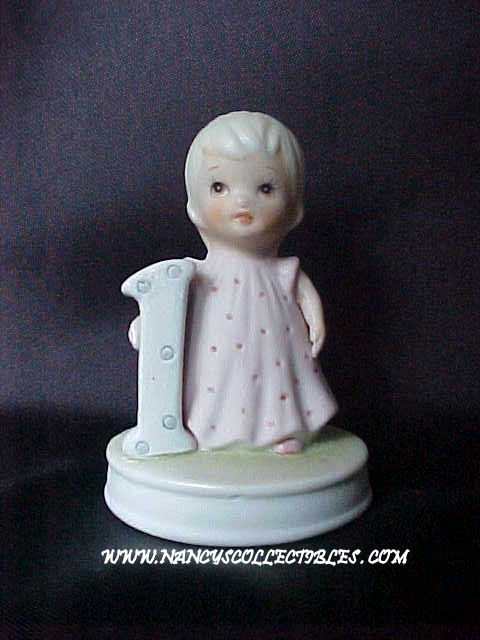 A really cute figurine for the 1st birthday! It is Lefton's "Christopher Collection" birthday series. This one is for that very special 1st birthday. She is wearing a pink dress, with dark pink polka-dots, and a bow in the back. The number "1" is standing next to her. Available in short, blonde or light brown hair with brown eyes. She is in excellent condition; no cracks, chips,or repairs. It is marked "The Christopher Collection, 1982,Geo.Z. Lefton, Lefton China,Handpainted,03448A.She measures 2-1/2" tall, 1-1/2" in diameter.