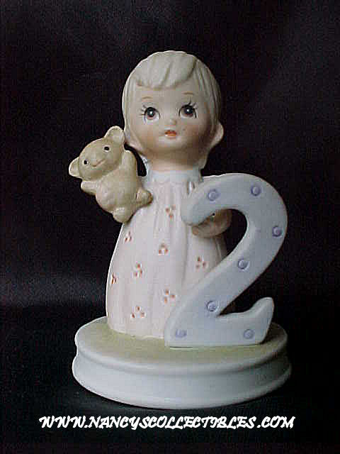 A really cute figurine for the 2nd birthday! It is Lefton's "Christopher Collection" birthday series. This one is for the 2nd birthday. She is wearing a pink nightgown with a white collar and bow in the back. She is holding a teddy bear. The number "2" is standing next to her. She is avail- able in short brown or blonde hair with brown eyes. She is in excellent condition; no cracks, chips, or repairs. It is marked "The Christopher Collection,1982,Geo.Z.Lefton, Lefton China,Handpainted, 03448B. She also has the red and gold foil sticker. She measures 2-3/4" tall, 1-3/4" in diameter.