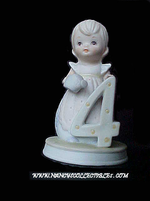 A really cute figurine for the 4th birthday! It is Lefton's "Christopher Collection" birthday series. This one is for the 4th birthday. She is wearing a blue flowered dress with a pink pinafore. She is carrying a watering can. The number "4" is standing in front of her. She is available in short brown or blonde hair with brown eyes. She is in excellent condition; no cracks, chips, or repairs. It is marked "The Christopher Collection, 1982, Geo.Z.Lefton, Lefton China, Handpainted, 03448D. She also has the red and gold foil sticker. She measures 3-1/2" tall, 2" in diameter.