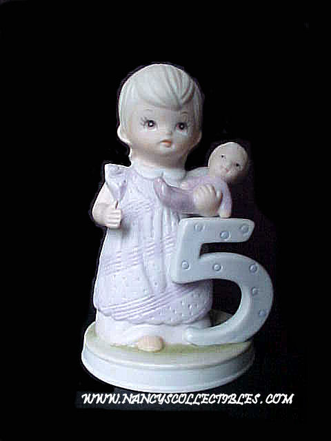A really cute figurine for the 5th birthday! It is Lefton's "Christopher Collection" birthday series. This one is for the 5th birthday. She is wearing an orchid pinafore with a bow in the back over a pale pink dress. She is holding her babydoll. The number "5" is standing next to her. She is available in short brunette hair with brown eyes. She is in excellent condition; no cracks, chips, or repairs. It is marked "1982,Christopher Collection, Geo.Z.Lefton, Lefton China, Handpainted,03448E. She measures 3-1/2" tall, 2-1/4" in diameter.