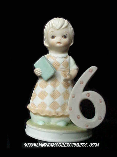 A really cute figurine for the 6th birthday! It is Lefton's "Christopher Collection" birthday series. This one is for the 6th birthday. She is wearing a pink and white ruffled pinafore with a bow in the back over a blue dress with a white collar and cuffed sleeves. She is holding a book. The number "6" is standing next to her. She is available in short light brown hair with brown eyes. She is in excellent condition; no chips, cracks, or repairs. It is marked "The Christopher Collection,1982,Geo. Z. Lefton, Lefton China, Handpainted, 03448F. She also has the red and gold foil sticker. She measures 3-3/4" tall, 2-3/4" in diameter.