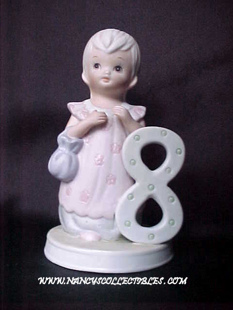 A really cute figurine for her 8th birthday! It is Lefton's "Christopher Collection" birthday series. This one is for the 8th birthday. She is wearing a pink flowered pinafore over a blue dress. She is carrying a handbag. The number "8" is standing next to her. Short very light brown or blonde hair with brown eyes is available. She is in excellent con- dition; no cracks, chips, or repairs. It is marked "Lefton China, The Christopher Collection,1982, Geo.Z.Lefton, Handpainted, 03448H. She measures 4-1/4" tall, 2-1/4" in diameter. The red and gold Lefton sticker is attached.