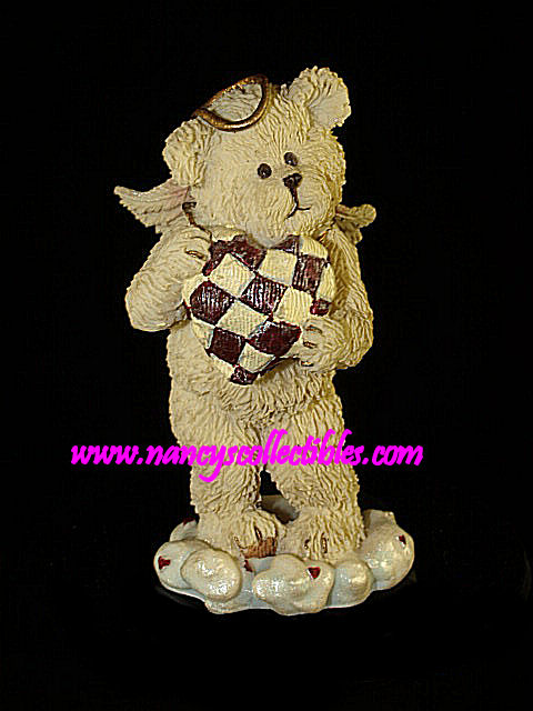 This is a Boyds Bear & Friends figurine. It is "Luvey". It is retired. It is a bear holding a burgundy and white quilted heart, standing on a fluffy cloud with hearts. His gold halo is a bit off kilter, but it was meant to be. He is in excellent condition; no chips, cracks, or repairs. It measures 3" tall, 1-1/2" wide. It is marked on the bot- tom "Boyds Bears & Friends,Lil Wings,A Loving Heart Is the Truest Wisdom,Luvey,Edition/pc #1E/78,style #24154,2002, The Boyds Bear Collection, LTD".
