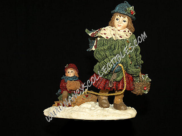 This is a Yesterdays' Child Dollstone Collection of the Boyd Collection Ltd. It is "Courtney w/Phoebe". It was retired 1997. It is a young girl carrying a basket of holly and berries while pulling a smaller child in a sled. It is in excellent condition; no chips, cracks, or repairs. It measures 5" tall, 4-1/2" wide. It is marked on the bottom "Yesterdays' Child, Dollstone Collection, Courtney w/Phoebe, Over The River and Through The Woods, Home Again Series No. 5, Edition/pc #5E/914,Style 3512, 1995". It is not in its box.