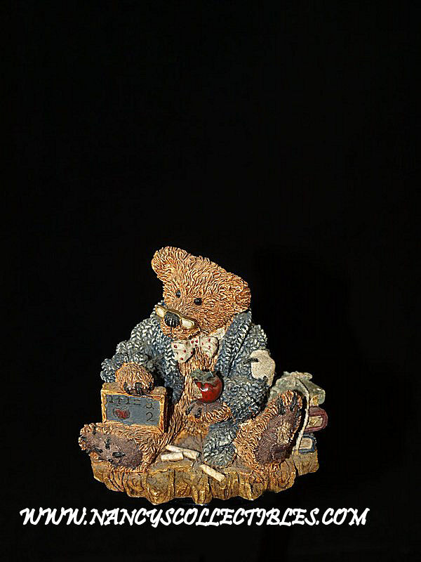 This is a Boyds Bear & Friends figurine. It is "Wilson The Perfesser". It was retired in 1997. It is a bear with glasses, a blackboard in one hand and an apple in the other. There is a stack of books to his left. He is wearing a dark blue sweater. It is in excellent condition; no chips, cracks, or repairs. It measures 3-1/4" tall, 3" wide. It is marked on the bottom "Boyds Bears & Friends,"A Teacher affects eternity;he can never tell where his influence stops." Henry Adams,Edi- tion/pc #3E/2078,style #2222, 1993 The Boyds Bear Collection, LTD".