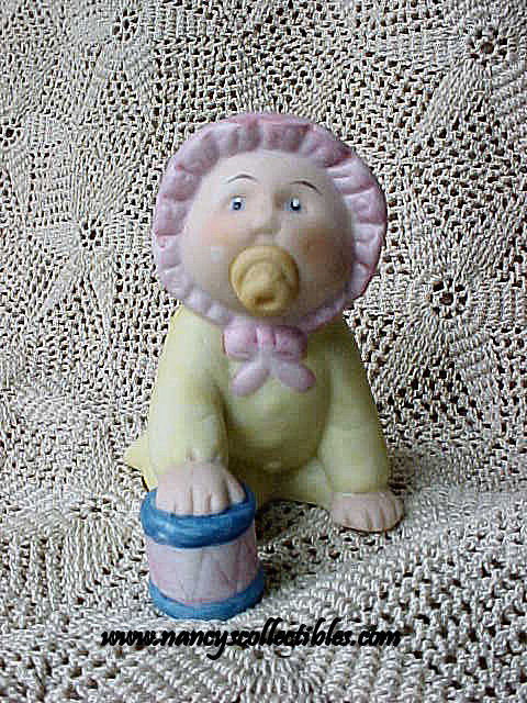 This is a Cabbage Patch figurine by Xavier Roberts. She is crawling with one hand and holding a toy drum in her right hand. She is wearing a pink bonnet and yellow pajamas. She has a pacifier in her mouth. It is in excellent condition; no chips, cracks, or re- pairs. It measures 2-1/2" tall and 2" wide. It is marked "1984, O.A.A., Inc., '84 Edition". There is also a gold foil label. It is marked "Special Thoughts For Special People".