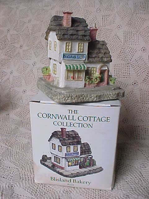 A small "mint in box" figurine of a building called "Blisland Baker" #BH14. It is from the Cornwall Cottage Collection. Each piece is hand-crafted and hand-painted to ensure excep- tional detail. Each side of the building has a different view. The front view has the sign above the door "Blisland Bakery". There is a blue and white striped awning over the front window which shows various baked goods. There are shrubs to one side of the front door and in front of a double window. The side view has a flour sack and box leaning against the wall of the bakery. The back view has shrubs and vines growing up the side of the bakery. The figurine is marked on the bottom with a partial foil sticker stating "Blisland Bakery, An exclusive creation by Cornwall Collectors Society Services, Inc., Made in China, 1992". It measures 3" tall, 3" wide, 2-3/4" deep. The box has some staining, but is otherwise in good condition.