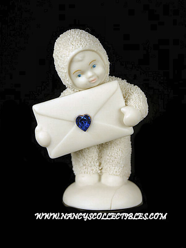A Snow Babies by Dept. 56 titled "Extra Special Delivery". She is standing holding an envelope with a blue Swarovski Crystal birthstone for December. It measures 3" tall; 1-3/4" wide. It is in very good condition; no chips. The base has been repaired.