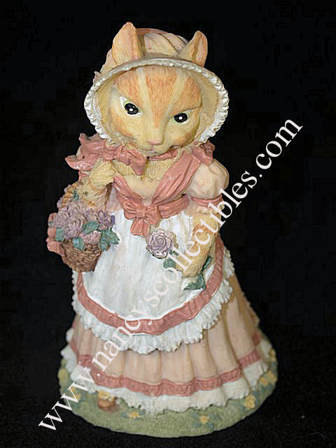 This is an International Resourcing figurine known as "Louisa Mousecatcher" from the Victorian Collection. The collections by International Resourcing have been discontinued since International Resourcing closed its doors. Louisa Mousecatcher is wearing a short-sleeved, pink dress, a lace trimmed white with pink trim apron, and a tan, lace trimmed bonnet. She is carrying a basket of flowers on one arm and a rose in the other hand. It is in excellent condition; no chips, cracks, or repairs. It measures 5-1/4" tall and 3-1/4" wide. It is marked "Louisa Mousecatcher,VA26 International Resourcing Services,1994". It is not in its original box.