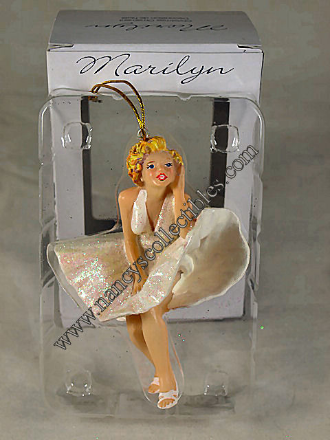A Kurt Adler ornament of "Marilyn Monroe" dated 2010. She is in the famous halter-type, wind-blown dress position. Her dress is white with glitter. It measures 4" tall. It is in excellent condition; in the original box and packing. It was removed from the box once only to take the picture. It has never been used. The box states "Photo by Sam Shaw, 2010 Sam Shaw Inc., Courtesy Shaw Family Archives, Ltd."