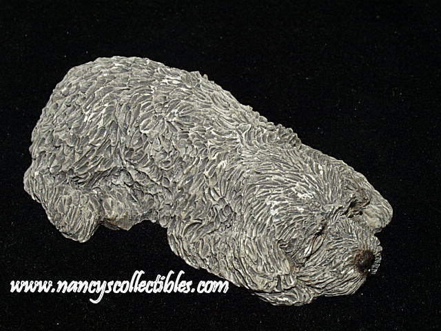 A detailed sleeping dog by Sandicast. He is gray with a black nose. He is in excellent condition; no chips, cracks, or repairs. He measures 3/4" tall and 3-3/4" long. He is marked "Sandicast, Lil Snoozer,1988".
