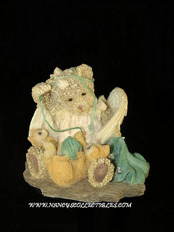 A Bear by United Design from the "Teddy Angels" series. It is titled "Always Close-Knit-Sweetie". He is sitting with a kitten in front playing with a ball of yarn and another kitten looking up at him at his side. There is blanket at his side with knitting needles. It measures 3" tall; 3-1/2" wide. It is in excellent condition. It is marked "Teddy Angels,Always Close-Knit,Sweetie,BA-024,1995,United Design Corporation".