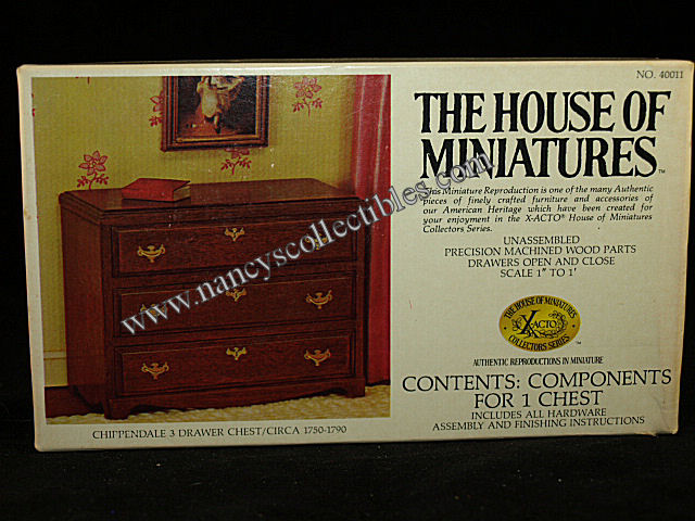A miniature reproduction of a Chippendale 3 Drawer Chest(ca.1750-1790) kit #40011 by The House of Mini- atures. It is in excellent condition and complete. It includes precision machined wood parts, drawers open and close, all hardware assembly and finishing instructions. Scale is 1" to 1'. It is dated 1976.